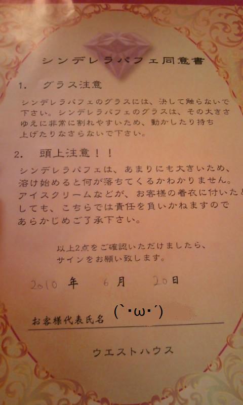 同意書。机の上にあって、内容を確認して記入。グラスが壊れるって何!?服が汚れるっていったい!?ドキドキしながらパフェの登場を待ちます。
